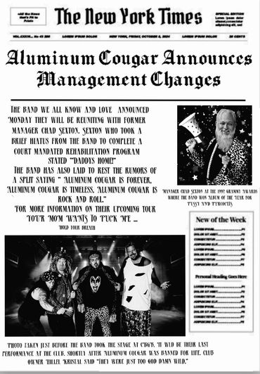 Nobody really knows where they came from, but they are here and wont go away. First discovered in the 80's, or maybe the 70's, era of metal, drugs, and groupies, Aluminum Cougar quickly made a name for themselves for all the wrong reasons. First there was the pyrotechnics incident when they tried to do their own on tour, which left one band member with a burned taint and another with no eyebrows. Then, of course, there was the incident at the Vatican that got them permanently banned from Vatican City. These incidents seemed counter productive at the time, but they put Aluminum Cougar on the map for good.